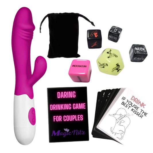 7-Piece Couples Foreplay Set - Rabbit Vibrator, Daring Drinking Card Game and Adult Sex Dice