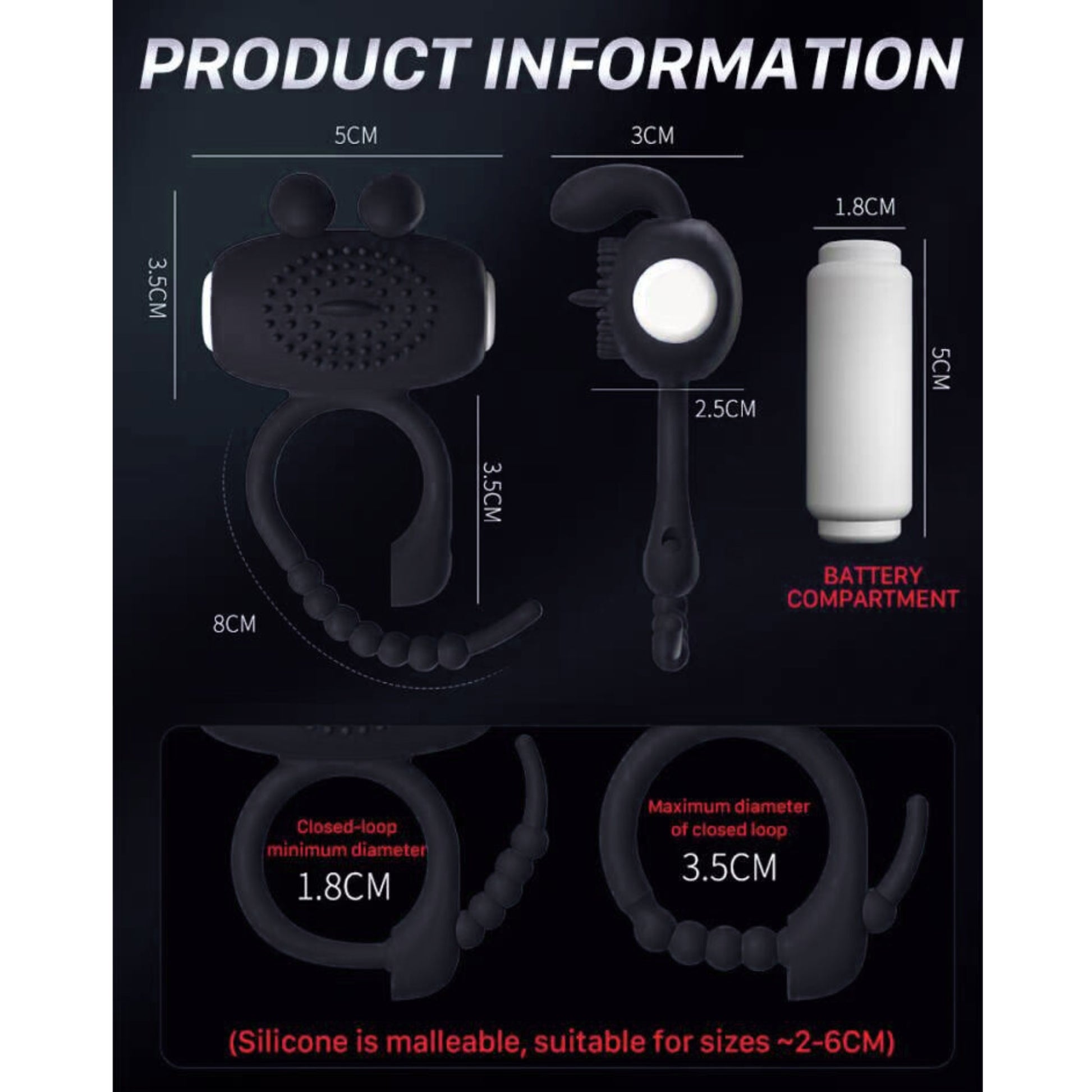 - Innovative adjustable ring fits diameters from 2–3cm up to 5–6cm (0.78–2.35in), adapting to different anatomies and preferences.